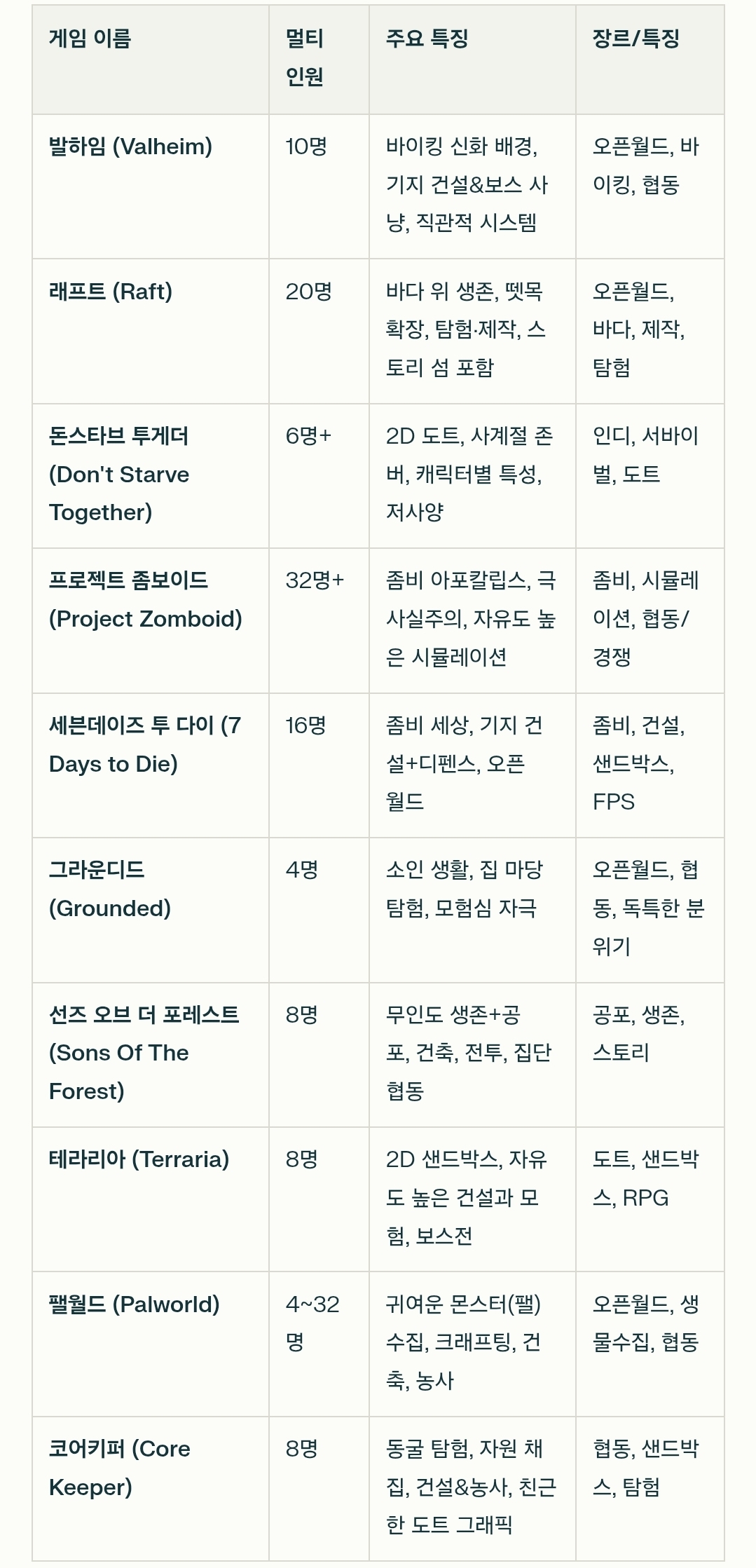 장르: 오픈월드 생존, 샌드박스, 협동/싱글플레이