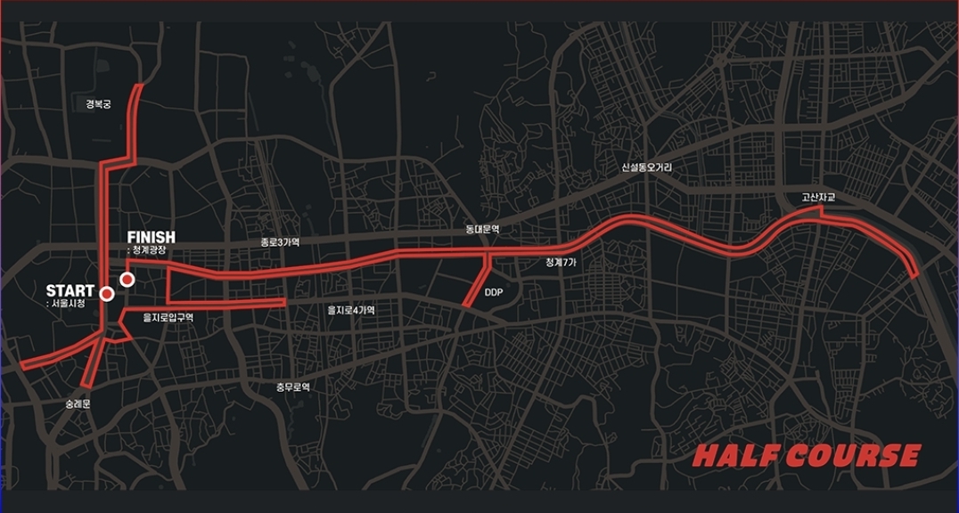 하프 마라톤(21.1km) 코스: 10km 코스 구간에 추가로 한강변과 공원 주변을 포함한 연장 루트가 구성되어 있어 난이도와 완주 만족도가 높습니다.
