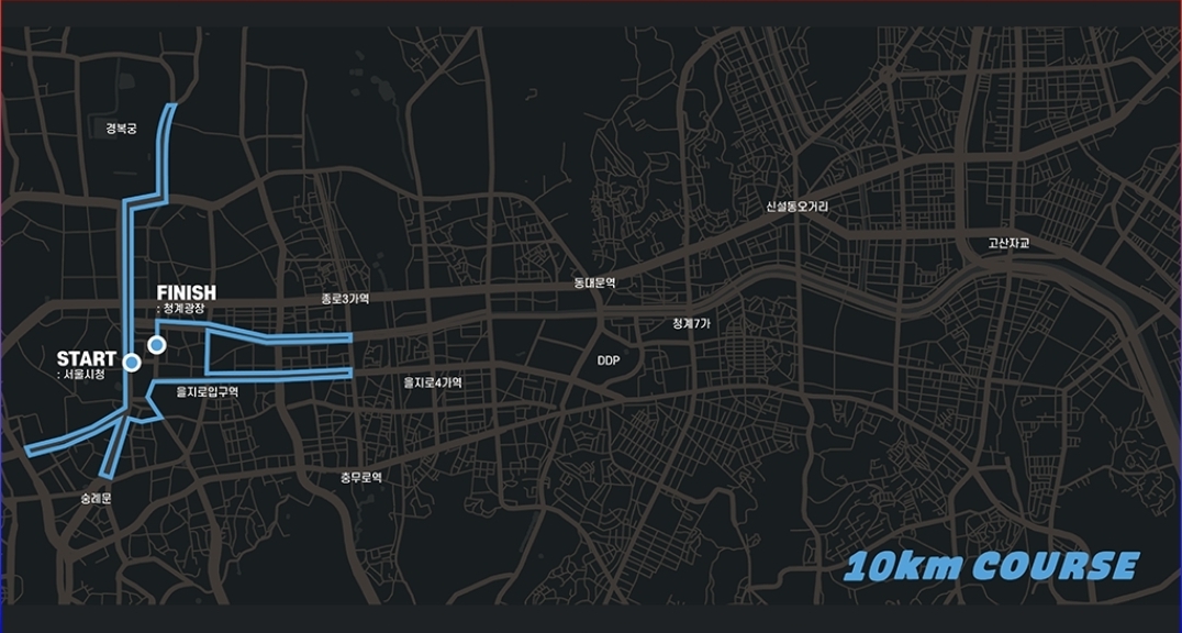 10km 코스: 서울광장을 출발해 청계천과 여의도 일대를 도는 도심과 강변 경로로, 초보자와 가족 단위 참가에 적합한 평지 위주 코스입니다.
