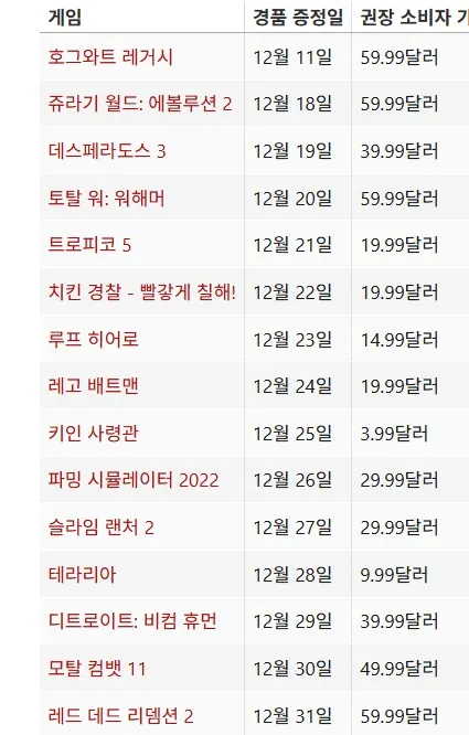 - 12월 12일~18일 오후 5시: 호그와트 레거시 무료 배포